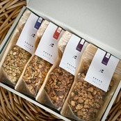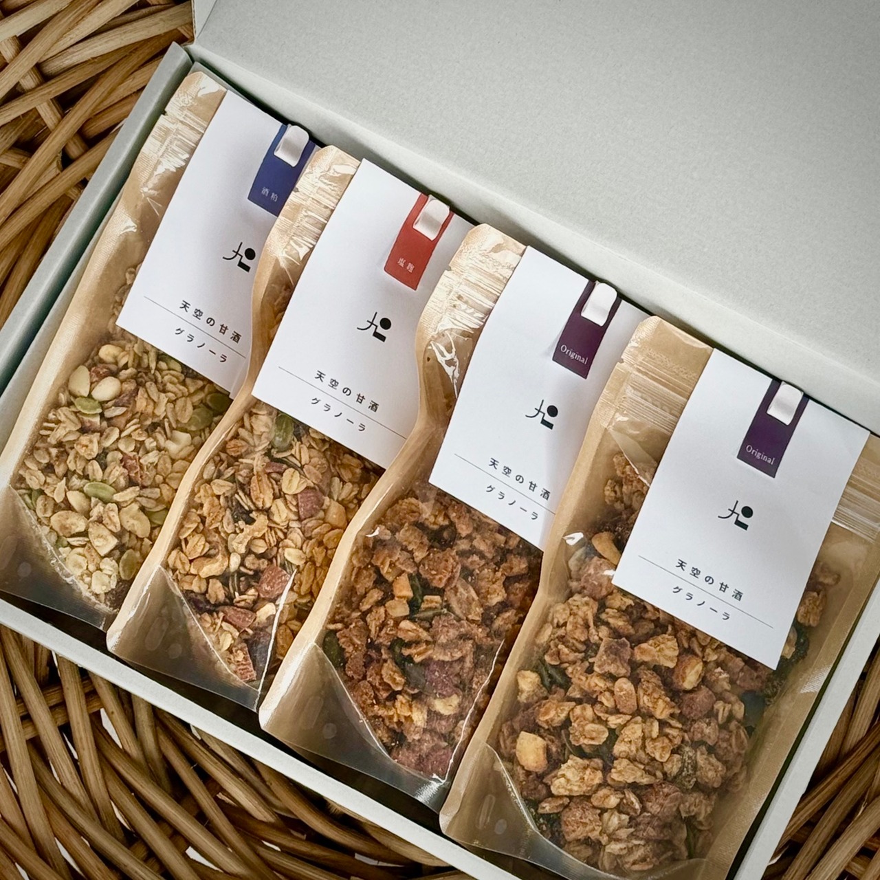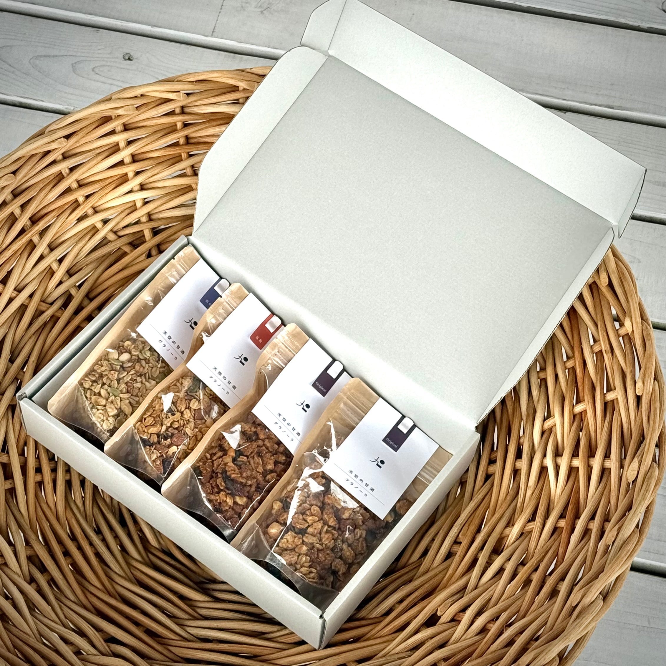 天空の甘酒グラノーラL 4個(Orijinal 2/塩麹 1/酒粕 1)を ギフトボックスに入れてお届けいたします。